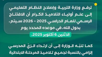 أكدت وزارة التربية وإصلاح النظام التعليمي أن الافتتاح الرسمي للعام الدراسي 2025 – 2026 سيكون في موعده المحدد يوم الإثنين…