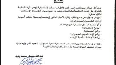 أصدر وزير الصحة عبد الله سيدي محمد وديه تعميما لتنظيم عمل الأطباء وأطباء الأسنان، وذلك عبر إرسال جداول عملهم في…