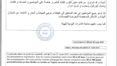 توقعت الهيئة الوطنية للأرصاد الجوية هطول أمطار مصحوبة برياح قوية يومي الخميس والجمعة، بعدة ولايات. وقالت الهيئة في تحذير لها،…