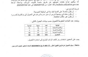 أعلنت وزارة التربية وإصلاح نظام التعليم، مساء اليوم الجمعة، فتح مجال تحويل 231 من معلمي اللغتين (العربية والفرنسية) من الداخل…