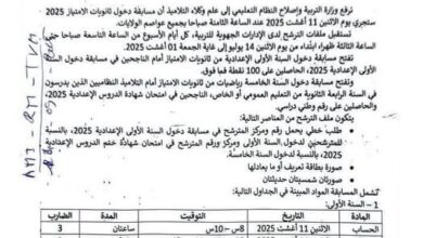 ترفع وزارة التربية وإصلاح النظام التعليمي إلى علم وكلاء التلاميذ أن مسابقة دخول ثانويات الامتياز 2025 ستجري يوم الاثنين 11…