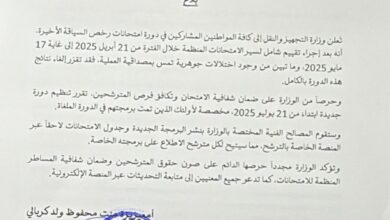 أعلنت وزارة التجهيز والنقل، إلغاء نتائج امتحانات رخص السياقة المنظمة خلال الفترة من 21 أبريل إلى 17 مايو 2025. وبررت…