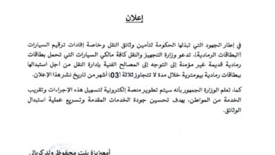 دعت وزارة التجهيز والنقل كافة مالكي السيارات التي تحمل بطاقات رمادية قديمة غير مؤمنة إلى التوجه إلى المصالح الفنية بإدارة…