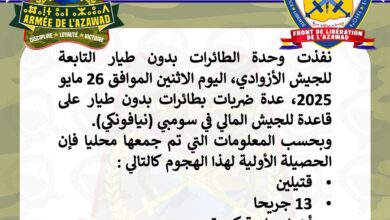 الموريتاني : أعلنت جبهة تحرير أزواد استهداف الجيش بطائرات بدون طيار، مؤكدة أنها تمكنت من قتل جنديين، وإصابة 13 آخرين…