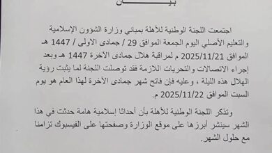 أعلنت اللجنة المركزية لمراقبة الأهلة ليل الجمعة/ السبت توصلها لما يثبت رؤية هلال شهر جمادى الآخرة من العام الهجري 1447.…