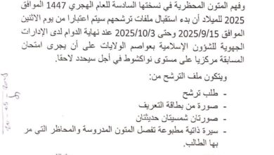 أعلنت وزارة الشؤون الإسلامية والتعليم الأصلي عن تنظيم النسخة السادسة من “مسابقة جائزة رئيس الجمهورية لحفظ وفهم المتون المحظرية”. وأوضحت…
