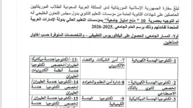 أعلنت سفارة موريتانيا في السعودية عن إتاحة 10 منح دراسية في دولة الإمارات للطلاب الموريتانيين الحاصلين على شهادة الثانوية العامة…
