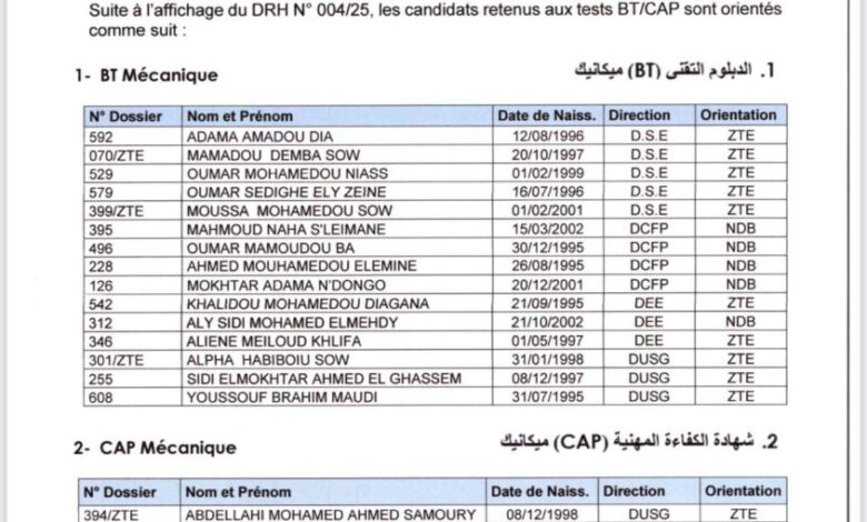 أعلنت شركة سنيم لوائح توجيه الناجحين في اختبارات حاملي شهادتي الكفاءة المهنية (CAP) والدبلوم التقني (BT).