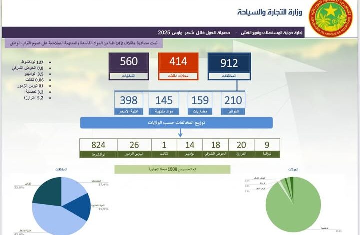أعلنت وزارة التجارة والسياحة أن فرق حماية المستهلك التابعة لها قامت ب 2880 عملية تفتيش تمكنت خلالها من رصد 912 من المخالفات موزعة كما يلي :