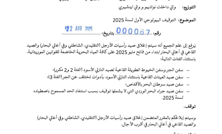 الموريتاني : أعلنت وزارة الصيد والبنى التحتية البحرية والمينائية فاتح مايو موعدا للتوقيف البيولوجي الأول في 2025.