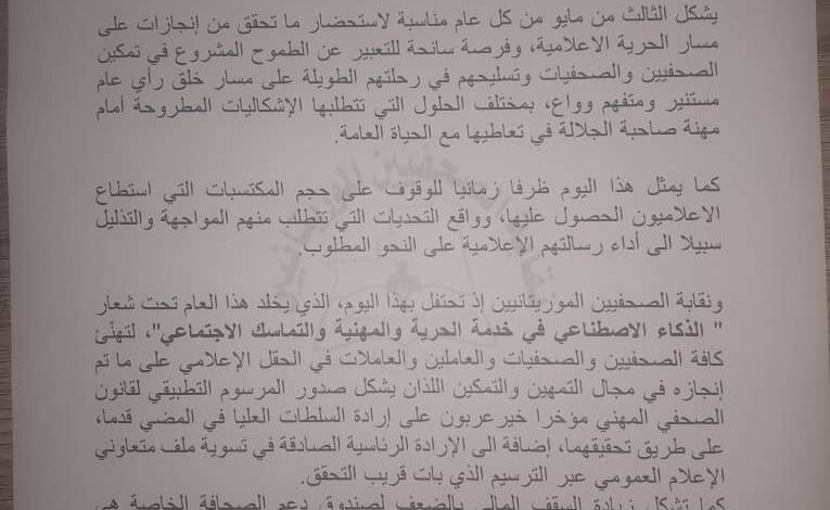 ونقابة الصحفيين الموريتانيين إذ تحتفل بهذا اليوم، الذي يخلد هذا العام تحت شعار ” الذكاء الاصطناعي في خدمة الحرية والمهنية والتماسك الاجتماعي”، لتهنْئ كافة الصحفيين والصحفيات والعاملين والعاملات في الحقل الإعلامي على ما تم إنجازه في مجال التمهين والتمكين اللذان يشكل صدور المرسوم التطبيقي لقانون الصحفي المهني مؤخرا خيرعربون على إرادة السلطات العليا في المضي قدما، على طريق تحقيقهما، إضافة الى الإرادة الرئاسية الصادقة في تسوية ملف متعاوني الإعلام العمومي عبر الترسيم الذي بات قريب التحقق.