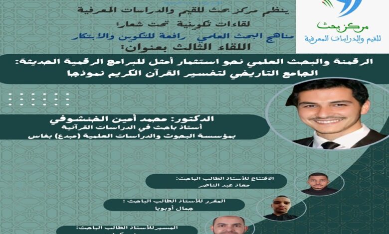 الموريتاني : نظّم مركز بحث للقيم والدراسات المعرفية لقاء تكوينيا حول موضوع: الرقمنة والبحث العلمي نحو استثمار أمثل للبرامج الرقمية الحديثة: الجامع التاريخي لتفسير القرآن الكريم نموذجا، من تأطير الدكتور محمد أمين الخنشوفي أستاذ وباحث في الدراسات القرآنية بمؤسسة البحوث .والدراسات العلمية (مبدع) بفاس، وذلك يوم السبت 26 أبريل 2025 على الساعة عبر المنصات الرقمية.