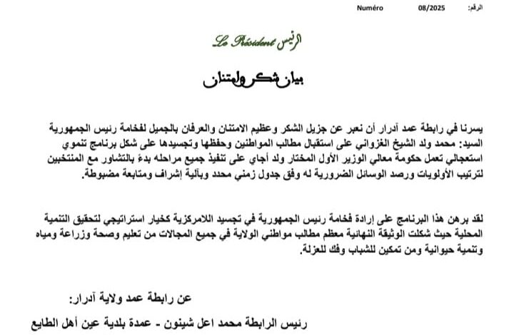 يسرنا في رابطة عمد آدرار أن نعبر عن جزيل الشكر وعظيم الامتنان والعرفان بالجميل لفخامة رئيس الجمهورية السيد: محمد ولد الشيخ الغزواني على استقبال مطالب المواطنين وحفظها وتجسيدها على شكل برنامج تنموي استعجالي تعمل حكومة معالي الوزير الأول المختار ولد أجاي على تنفيذ جميع مراحله بدءً بالتشاور مع المنتخبين لترتيب الأولويات ورصد الوسائل الضرورية له وفق جدول زمني محدد وبآلية إشراف ومتابعة مضبوطة.