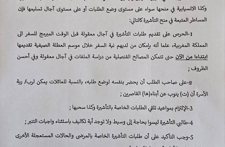 بإمكان طالبي التأشيرة الراغبين في قضاء العطلة الصيفية بالمغرب التقدم بطلباتهم أبتداء من الٱن من أجل تيسير معالجة الطلبات في الوقت المناسب وضمانا لأنسيابية العمل.( وثيقة رسمية).