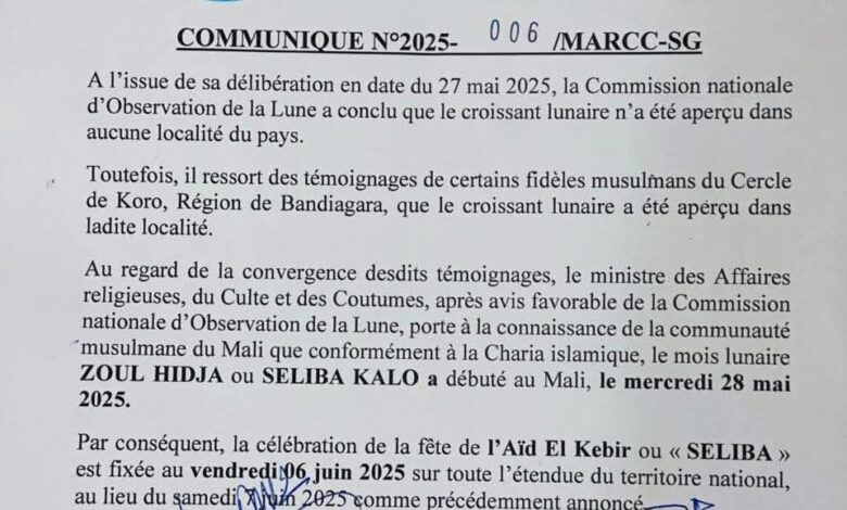 وجاء الإعلان عبر بلاغ رسمي صادر عن وزارة الشؤون الدينية والعبادات، نقل في نشرة إخبارية عاجلة عبر التلفزيون الوطني المالي، وأكد أن القرار يستند إلى تقارير موثوقة من دائرة كورو، بمنطقة باندياغارا، حيث أبلغ عدد من المواطنين عن رؤية الهلال مساء الثلاثاء 27 مايو.