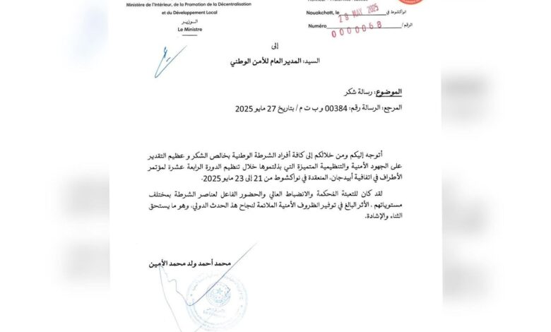 وقال ولد محمد الأمين في رسالة وجهها إلى المدير العام للأمن الوطني: “أتوجه إليكم بخالص الشكر والامتنان على الجهود الأمنية والتنظيمية المتميزة التي بذلتموها خلال تنظيم الدورة الرابعة عشرة لمؤتمر الأطراف في اتفاقية أبيدجان، المنعقدة في نواكشوط من 21 الى 23 مايو 2025”.