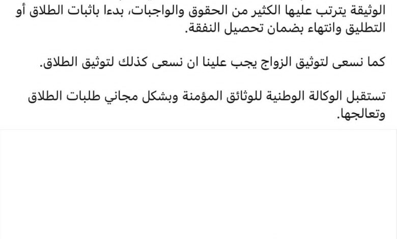 وأكدت بنت انتهاه في تدوينة على حسابها في فيسبوك أن الوكالة الوطنية لسجل السكان والوثائق المؤمنة تستقبل طلبات توثيق الطلاق وتعالجها بشكل مجاني.