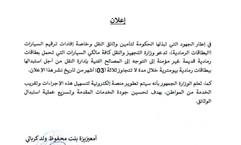 في إطار الجهود التي تبذلها الحكومة لتأمين وثائق النقل وخاصة إفادات ترقيم السيارات (البطاقات الرمادية)، تدعو وزارة التجهيز والنقل كافة مالكي السيارات التي تحمل بطاقات رمادية قديمة غير مؤمنة إلى التوجه إلى المصالح الفنية بإدارة النقل من أجل استبدالها ببطاقات رمادية بيومترية خلال مدة لا تتجاوز ثلاثة (03) أشهر من تاريخ نشر هذا الإعلان.