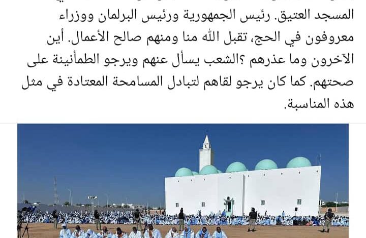 وتساءل الوزير ولد أحمد ديه في تدوينة نشرها على صفحته بالفيس بوك، عن عذر أعضاء الحكومة والمسؤولين السامين المدنيين والعسكريين في التخلف عن صلاة العيد في المسجد العتيق.