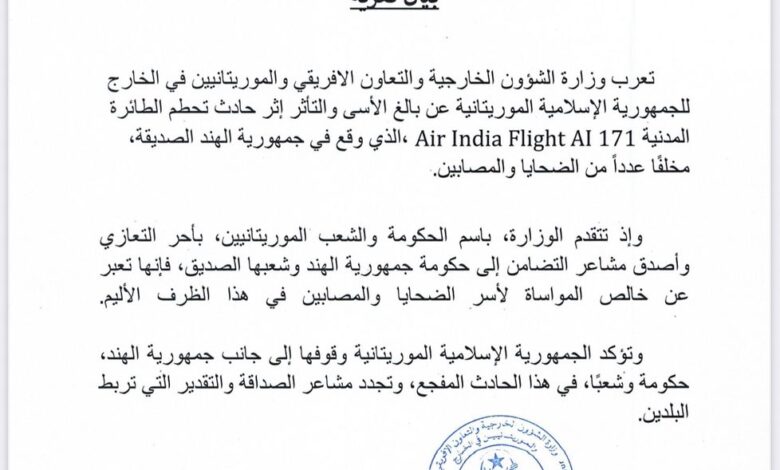 موريتانيا تُعزّي الهند في ضحايا الطائرة المتحطمة