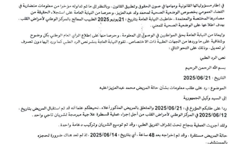 وأكدت النيابة أن الطبيب أبلغها في رده أن ولد عبد العزيز تم استقباله بتاريخ 2025/06/12 في المركز الوطني لأمراض القلب من أجل إجراء عملية قسطرة علاجية مبرمجة لشريان تاجي واحد.