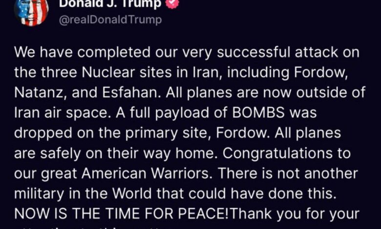وأكد ترامب في تغريدة عبر منصة “تروث سوشيال” أنه تم إسقاط حمولة كاملة من القنابل على الموقع النووي الأساسي في فوردو، مردفا أن موقع فوردو النووي انتهى.