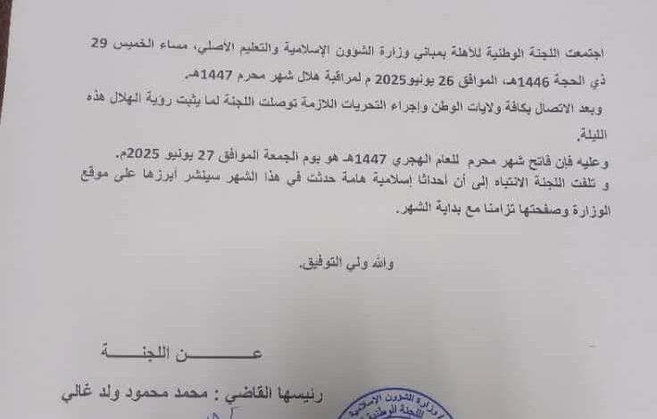 أعلنت اللجنة الوطنية للأهلة غدا الجمعة 27 يونيو 2025 فاتح شهر محرّم للعام الهجري 1447 هجرية.