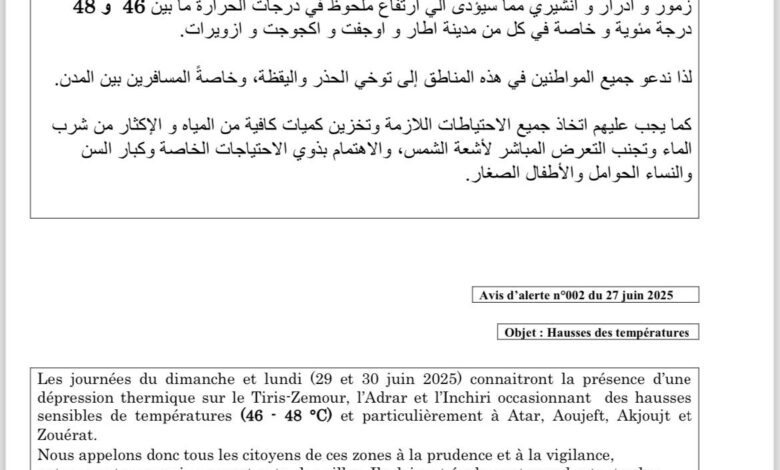 توقعت الهيئة الوطنية للأرصاد الجوية أن تشهد أيام الأحد والاثنين 29 و 30 يونيو وجود منخفض حراري على تيرس زمور وآدرار وإينشري، سيؤدي إلى ارتفاع درجات الحرارة.