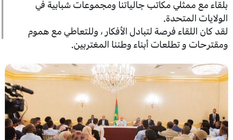 وعبر ولد الغزواني في تدوينة نشرها على صفحته في موقع “إكس” عن سعادته باللقاء بممثلي الجالية، ووصفه بأنه كان فرصة لتبادل الأفكار.