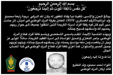 أعرب قائد أركان الدرك الوطني عن بالغ الحزن لوفاة الدركي محمدو ولد ابراهيم وأفراد أسرته إثر حادث سير مروع، مقدماً أحرّ التعازي والمواساة لذوي الفقيد وزملائه، سائلاً المولى عز وجل أن يتغمدهم بواسع رحمته ويسكنهم فسيح جناته