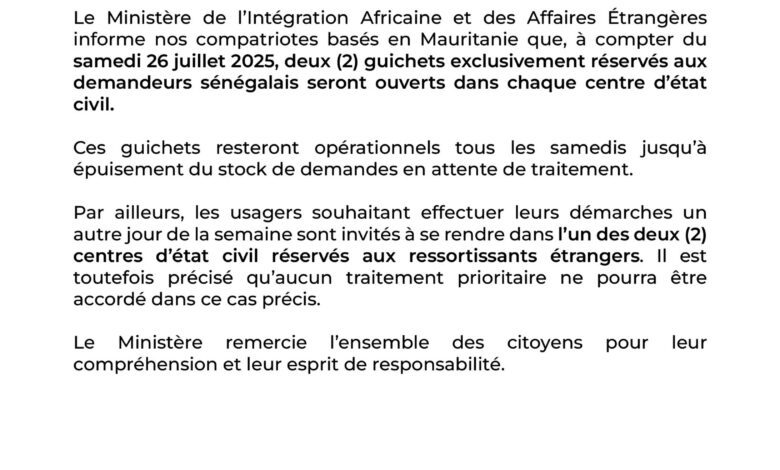 أعلنت وزارة الخارجية السنغالية اليوم الجمعة، عن فتح شباكين (2) مخصصين للسنغاليين المقيمين في موريتانيا على مستوى مختلف مراكز الحالة المدنية كل يوم سبت ابتداء من يوم غد، وذلك “إلى غاية انتهاء الطلبات المتراكمة التي تنتظر المعالجة”.