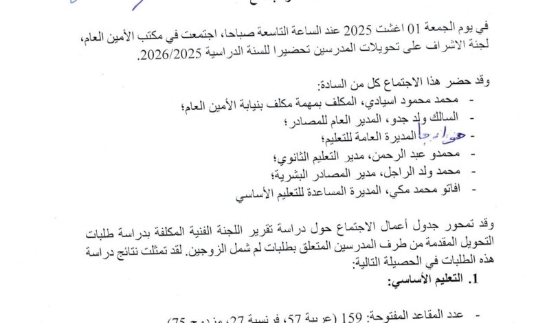 أعلنت وزارة التربية وإصلاح النظام التعليمي، عبر لجنة الإشراف على تحويلات المدرسين، نتائج دراسة ملفات التحويل المقدمة من المدرسين استعدادا للعام الدراسي 2025-2026، وذلك خلال اجتماع عقدته اللجنة صباح الجمعة فاتح أغسطس 2025 بمكتب الأمين العام.