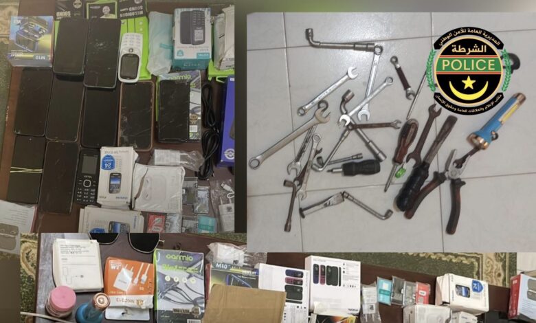 أعلنت الشرطة الوطنية أن دورية تابعة للمفوضية الثانية بمقاطعة تيارت في نواكشوط، ألقت القبض على شابين كانا بحوزتهما حقيبتان تحتويان على مسروقات تعود لمحل لبيع الهواتف في منطقة دار البركة.