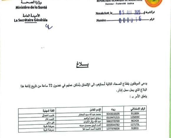 دعت وزارة الصحة، مجموعة من الأطباء والممرضين إلى الالتحاق بعملهم في غضون 72 ساعة.