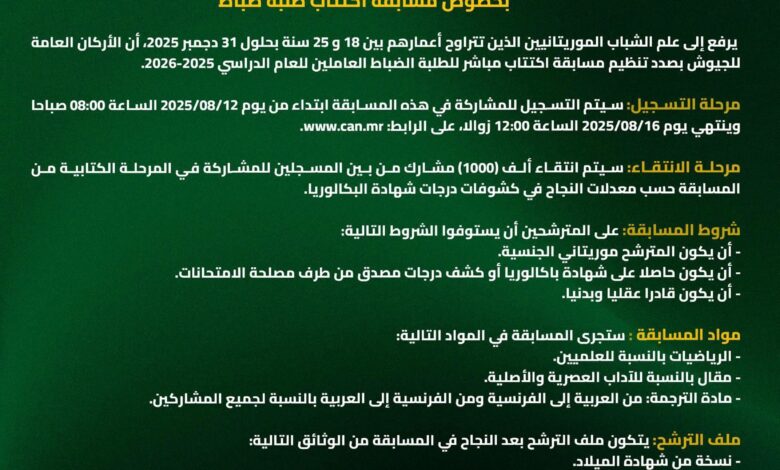 وأشار الجيش إلى أن مرحلة التسجيل ستتم عبر الرابط: www.can.mr، وذلك ابتداء من يوم 2025/08/12 الساعة 08:00 صباحا وينتهي يوم 2025/08/16 الساعة 12:00 زوالا.