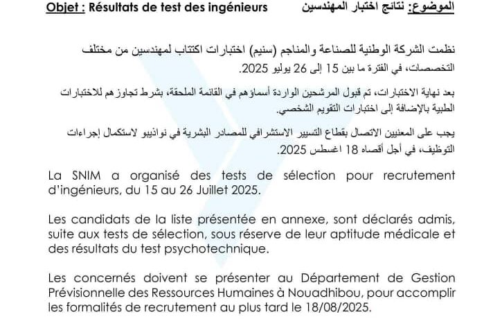 أعلنت الشركة الوطنية للصناعة والمناجم “سنيم” النتائج النهائية لمسابقة اكتتاب المهندسين من مختلف التخصصات.
