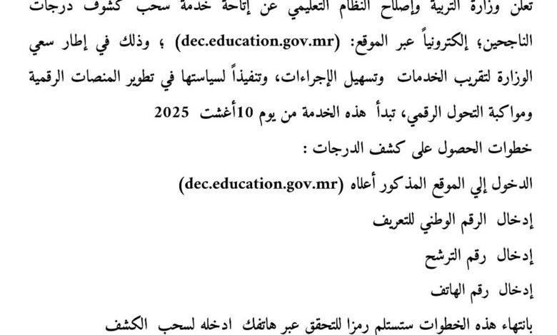 أعلنت وزارة التربية وإصلاح النظام التعليمي عن إتاحة خدمة سحب كشوف درجات الناجحين في الباكلوريا هذا العام إلكترونياً عبر الموقع: (dec.education.gov.mr).