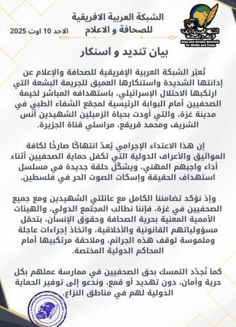 تُعبّر الشبكة العربية الإفريقية للصحافة والإعلام عن إدانتها الشديدة واستنكارها العميق للجريمة البشعة التي ارتكبها الاحتلال الإسرائيلي، باستهدافه المباشر لخيمة الصحفيين أمام البوابة الرئيسية لمجمّع الشفاء الطبي في مدينة غزة، والتي أودت بحياة الزميلين الشهيدين أنس الشريف ومحمد قريقع، مراسلي قناة الجزيرة.