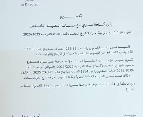 ألزمت وزارة التربية وإصلاح النظام التعليمي جميع مؤسسات التعليم الخاص باحترام التاريخ المحدد لافتتاح السنة الدراسية 2025/2026، وهو يوم الاثنين 06 أكتوبر 2025.