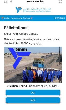 حذرت الشركة الوطنية للصناعة والمناجم “سنيم” من فتح رابط منتحل لاسمها، مؤكدة أنها “ليست لها علاقة بهذا الموقع”، بحسب تعبيرها.