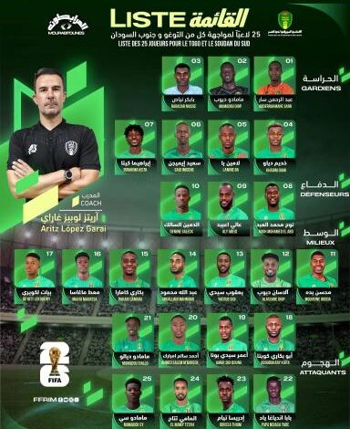 كشف الاتحاد الموريتاني لكرة القدم عبر صفحته الرسمية عن تشكيلة المنتخب الموريتاني لكرة القدم التي إختارها المدرب الإسباني أرتيز لوبيز غاراي والتي ستخوض الجولتين السابعة والثامنة من تصفيات إفريقيا المؤهلة لكأس العالم 2026.