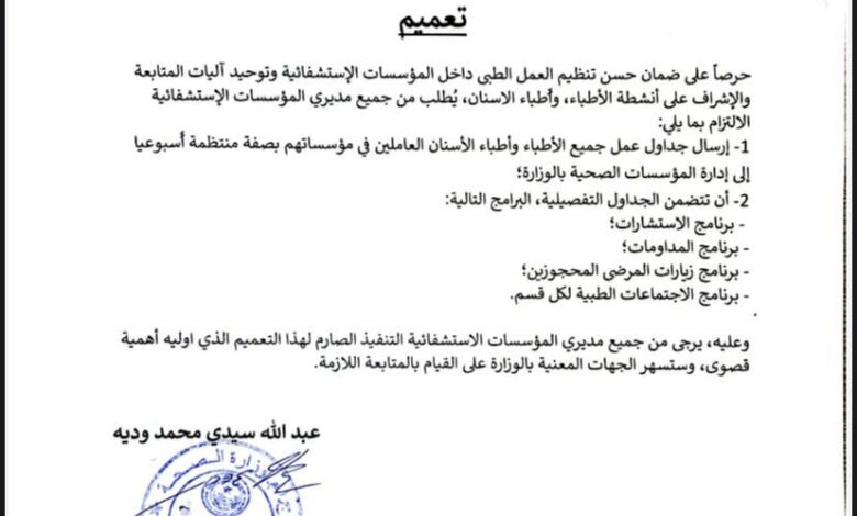 أصدر وزير الصحة عبد الله سيدي محمد وديه تعميما لتنظيم عمل الأطباء وأطباء الأسنان، وذلك عبر إرسال جداول عملهم في مؤسساتهم بصفة منتظمة أسبوعيا إلى إدارة المؤسسات الصحية بالوزارة.