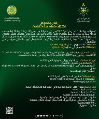 أعلنت الأركان العامة للجيوش، عبر فرقة التكوين، عن تنظيم مسابقة اكتتاب مباشر يوم 30 سبتمبر 2025 لانتقاء عشرة ضباط صف تقنيين في تخصص الكهرباء، ضمنهم: