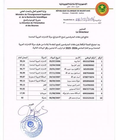 أعلنت اللجنة المكلفة بفرز ملفات المترشحين للمنح المقدمة لموريتانيا من طرف دولة الإمارات العربية المتحدة للعام الجامعي 2026 2025.