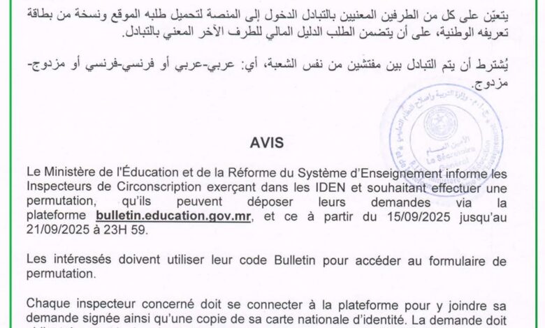وأوضحت الوزارة أن الطلب يجب أن يتضمن استمارة الموقع ونسخة من بطاقة التعريف الوطنية، ودليل مالي للطرف الآخر المعني بالتبادل، على أن يكون التبادل بين مفتشين من نفس الشعبة: عربي – عربي، فرنسي – فرنسي، أو مزدوج.