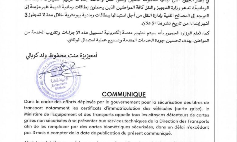 دعت وزارة التجهيز والنقل إلى استبدال البطاقات الرمادية غير المؤمنة ببطاقات رمادية بيومترية خلال ثلاثة أشهر.