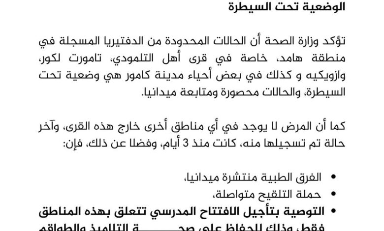 قالت وزارة الصحة في توضيح أصدرته في وقت متأخر من ليل الاثنين إن التوصية بتأجيل الافتتاح الدراسي، والتي أصدرتها في بيان مسائي تتعلق بالمناطق التي توجد فيها حالات من الدفتيريا، في منطقة هامد بولاية العصابة، وذلك للحفاظ على صحة التلاميذ، والطواقم التدريسية.