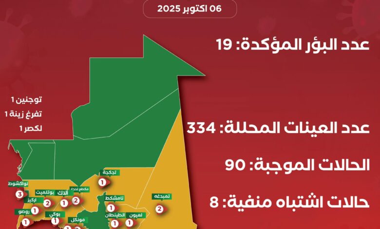 وقالت وزارة التنمية الحيوانية في بيان، إن موريتانيا تواجه حاليا موجة من وباء حمى الوادي المتصدع “حيث سجلت أول بؤرة للمرض يوم 15سبتمبر 2025 في قرية الشام التابعة لبلدية دار البركه في مقاطعة بوكى ولاية لبراكنة، ثم سجلت المصالح البيطرية، حتى يوم 5 اكتوبر 2025، ما مجموعه 19 بؤرة موزعة على 16 مقاطعة، تتبع لثمان ولايات.