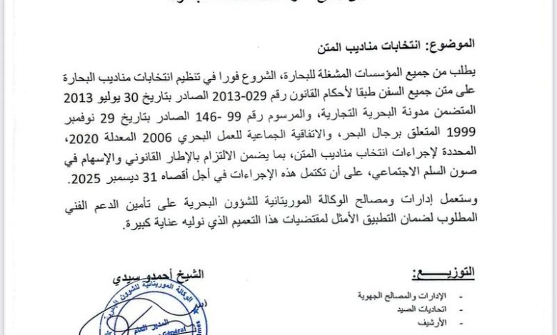 طالبت الوكالة الموريتانية للشؤون البحرية كافة المؤسسات المشغلة للبحارة الشروع فورا في تنظيم انتخابات مناديب عمال البحر.