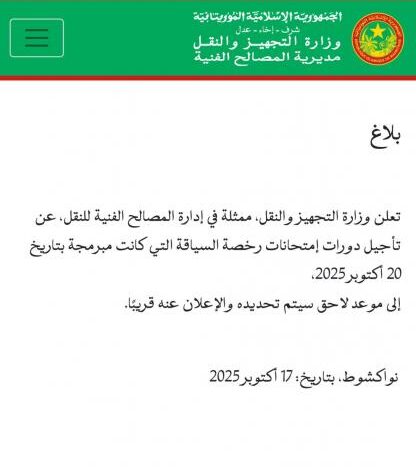 أعلنت وزارة التجهيز والنقل، ممثلة في إدارة المصالح الفنية للنقل، عن تأجيل دورات امتحانات رخصة السياقة التي كانت مبرمجة بتاريخ 20 أكتوبر 2025، إلى موعد لاحق سيتم تحديده والإعلان عنه قريبًا.